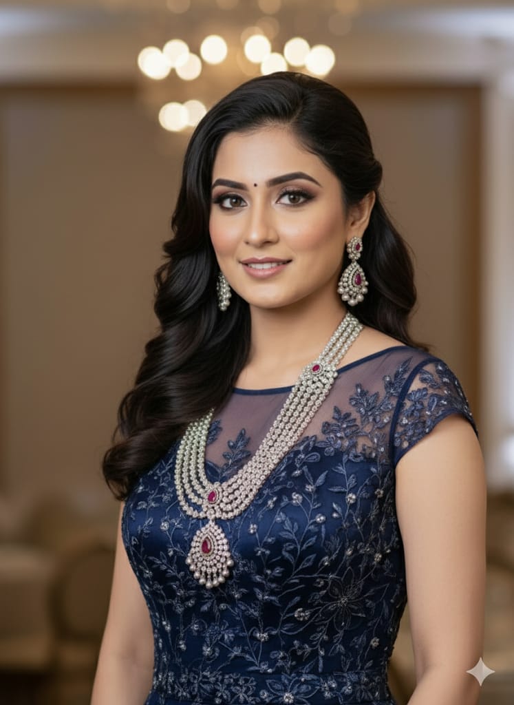South Indian hair jewelry typically includes elaborate gold-plated or temple jewelry-style pieces...