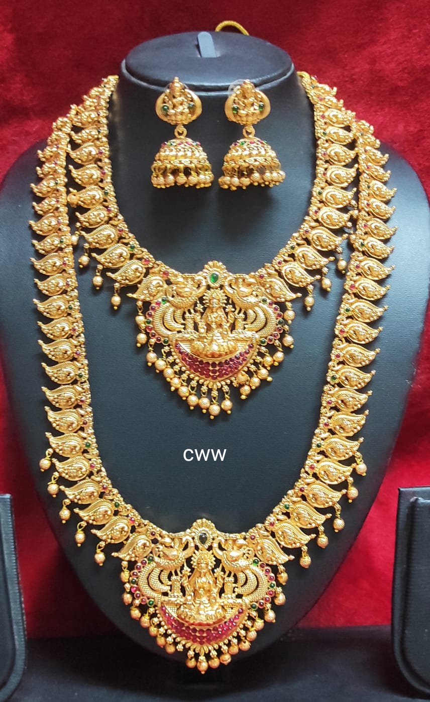 Traditional temple-inspired bridal jewelry sets adorned with divine motifs, crafted to enhance your bridal look with grandeur and grace.