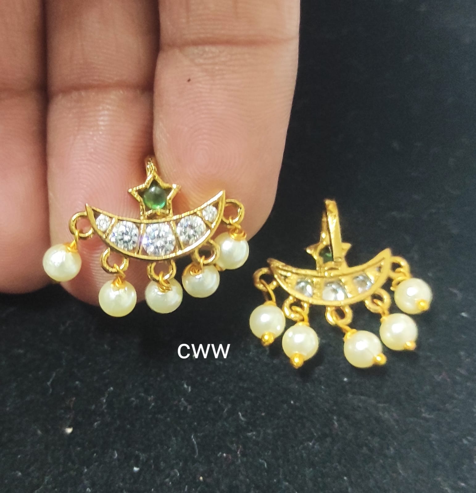 The image shows a beautiful pair of traditional Bugadi earrings, typically worn on the upper ear. These earrings feature a crescent moon-shaped design crafted in gold-tone metal, embellished with sparkling white stones across the crescent. At the top, there is a green star-shaped stone, adding a vibrant touch of color.
