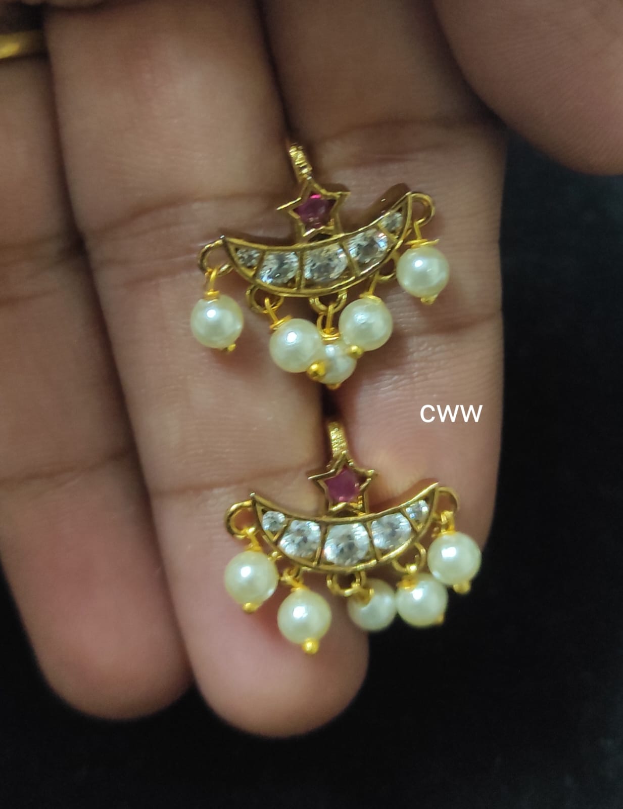 Dangling from the bottom of the crescent are delicate white pearls, enhancing the earring’s elegance and traditional appeal. The design blends a celestial motif with classic Indian ornamentation, making it ideal for festive or ethnic wear. The fine craftsmanship and detailing give the Bugadi a graceful and timeless look.
