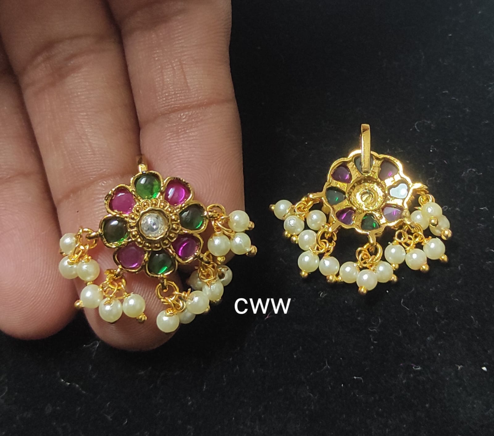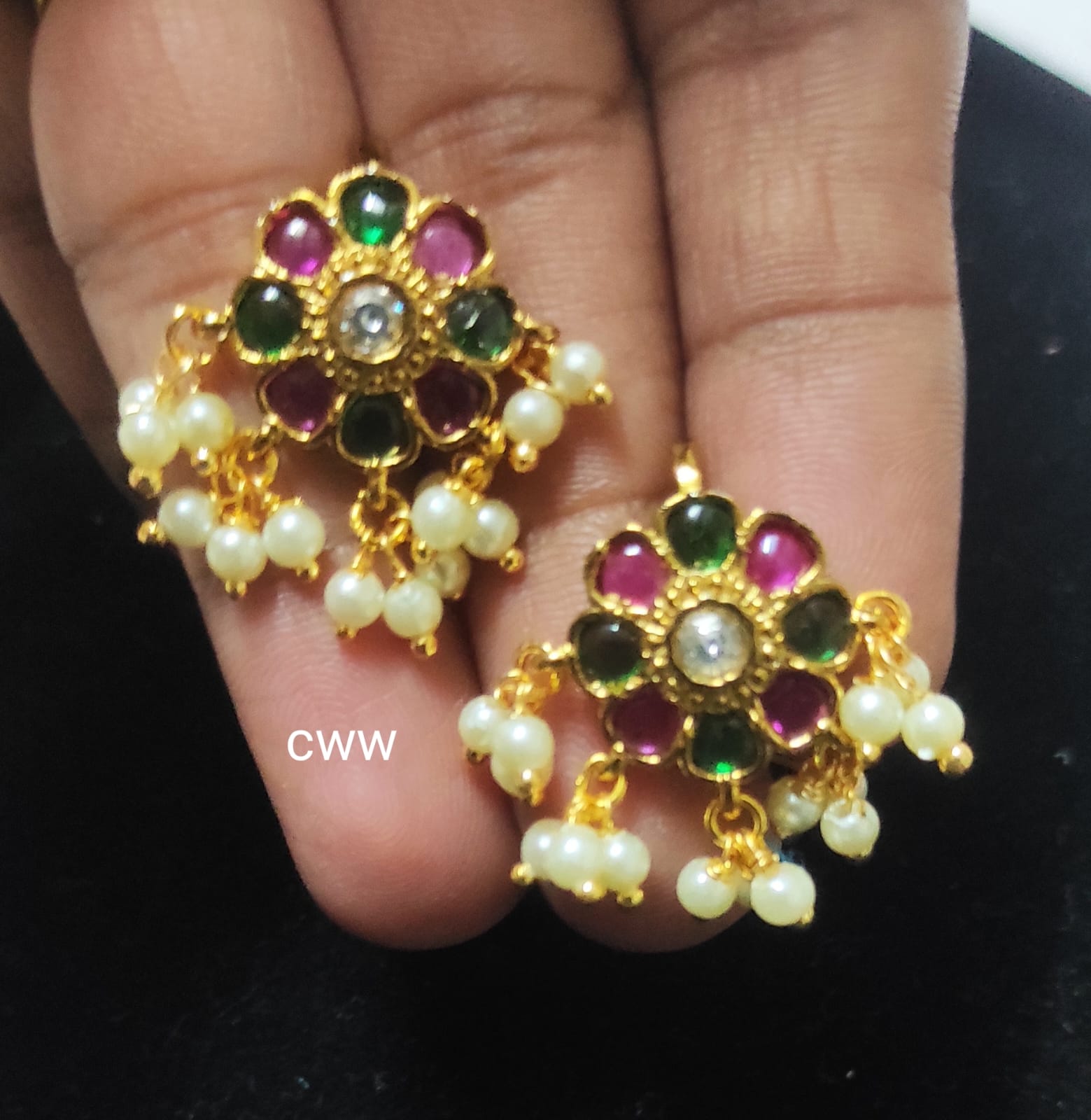 Dangling from the lower edge are tiny white pearl drops that enhance the earring’s elegance and movement. The combination of rich colors, gold detailing, and pearls gives these Bugadi earrings a vibrant and royal appeal, making them perfect for traditional or festive wear.