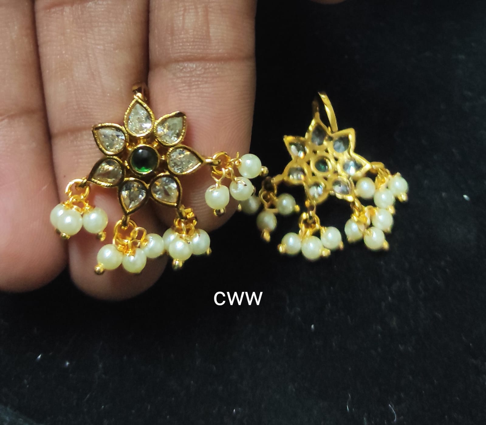 Dangling gracefully from the bottom are clusters of tiny white pearls, enhancing the traditional charm of the design. The earrings have a rich, classic appeal — perfect for festive or ethnic occasions — and beautifully combine the sparkle of stones with the timeless beauty of pearls.