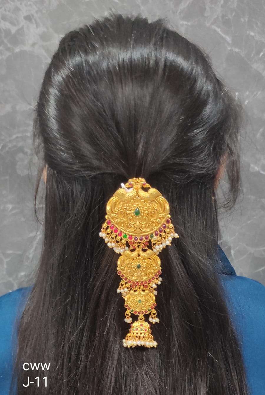 The image shows a traditional South Indian hair accessory known as a "Jada Billa" or "Jadai Nagam", beautifully adorned on long, dark hair. This specific design is a temple-style gold Jada Billa, embellished with red and green stones and fine gold detailing. The piece has a regal and ornate appearance, commonly worn by brides or during classical dance performances like Bharatanatyam. The code "CWW J-11" at the bottom left may refer to the product or catalog number.