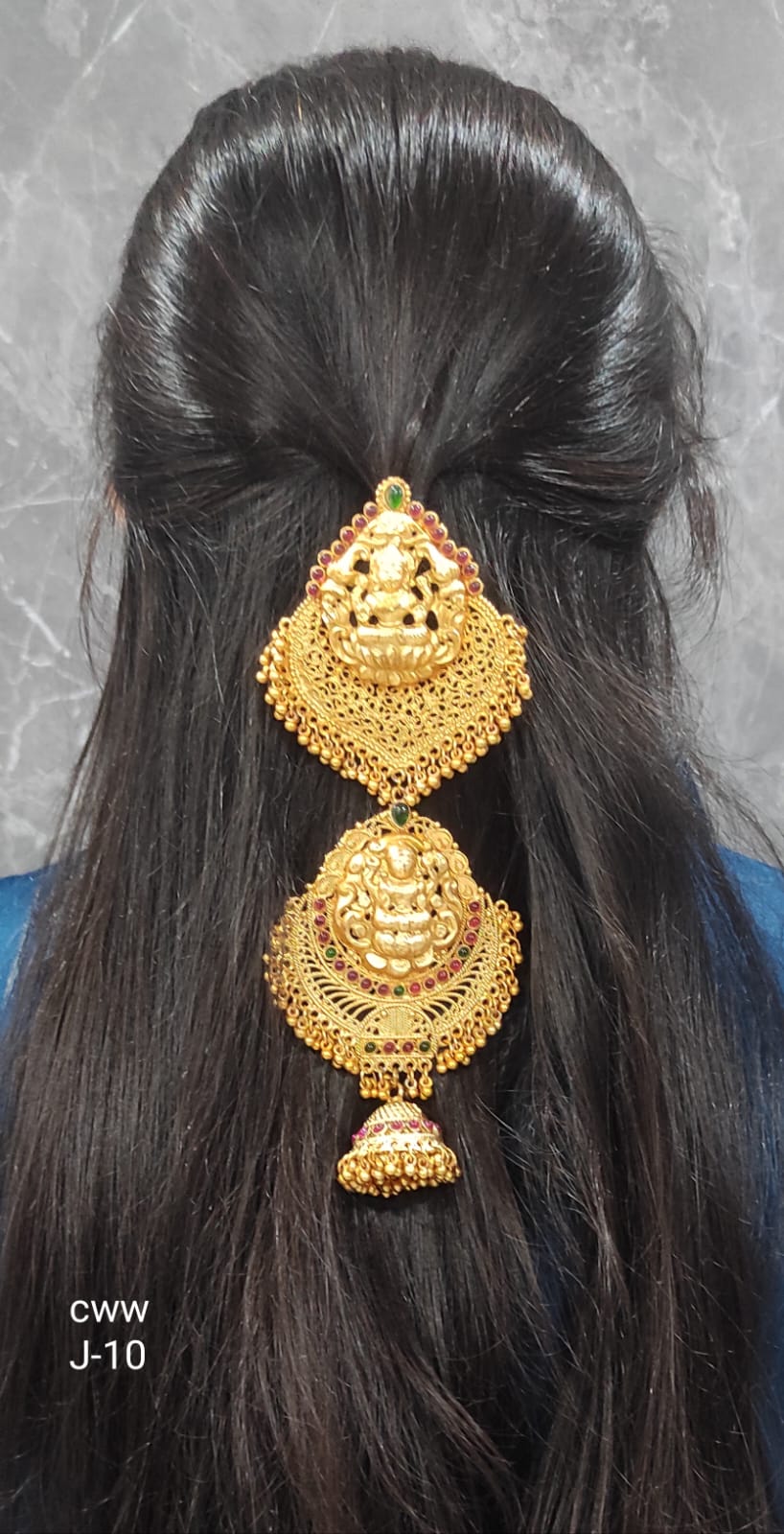 The image shows a traditional South Indian hair accessory known as a "Jada Billa" or "Jadai Nagam", beautifully adorned on long, dark hair. This specific design is a temple-style gold Jada Billa, featuring intricate carvings of deities (likely Goddess Lakshmi), embellished with red and green stones and fine gold detailing. The piece has a regal and ornate appearance, commonly worn by brides or during classical dance performances like Bharatanatyam. The code "CWW J-10" at the bottom left may refer to the product or catalog number.