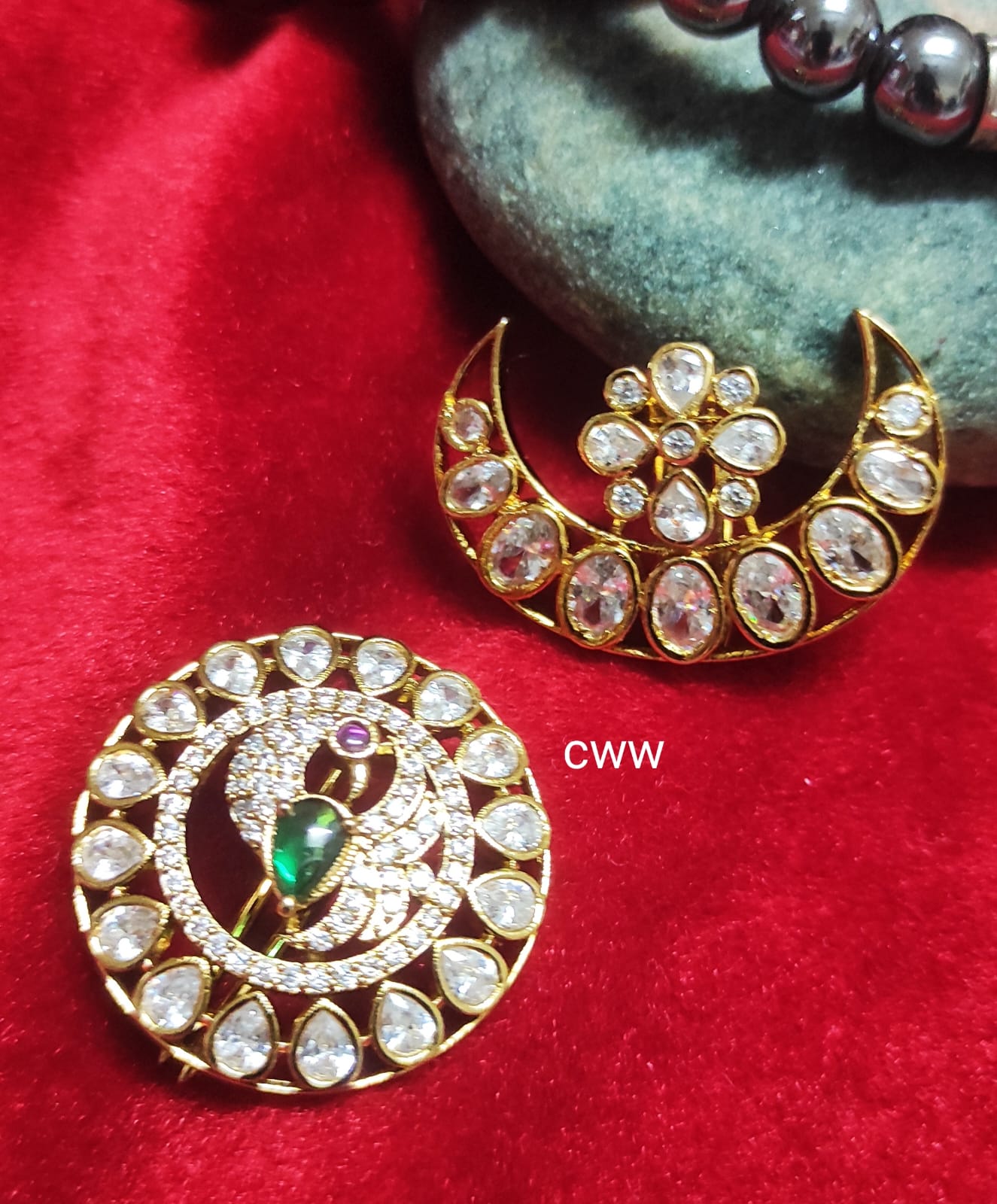South Indian hair jewelry typically includes elaborate gold-plated or temple jewelry-style pieces adorned with kundan, pearls, rubies, emeralds, and goddess motifs. The designs often reflect heritage art inspired by temple carvings and deities like Lakshmi.