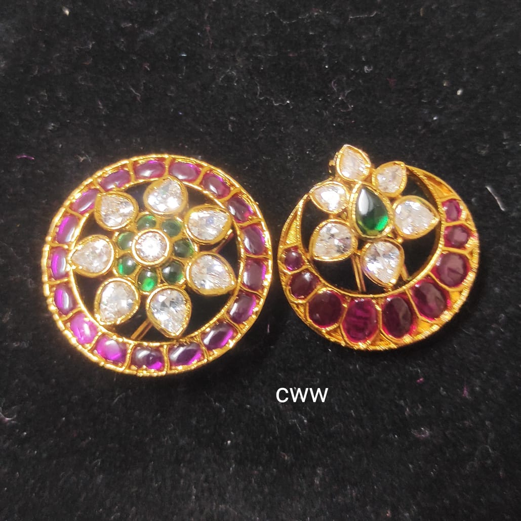 South Indian hair jewelry typically includes elaborate gold-plated or temple jewelry-style pieces adorned with kundan, pearls, rubies, emeralds, and goddess motifs. The designs often reflect heritage art inspired by temple carvings and deities like Lakshmi.